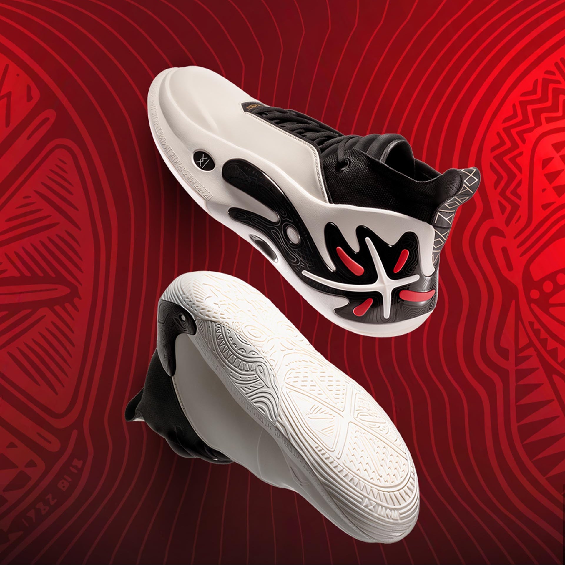 Leather upper for support and wrap-up feel, showcasing the texture and comfort. Left and right outsoles designed in different patterns of Dwyane Wade's avatar, Way of Wade brand logo, and natural elements, paying tribute to D. Wade and conveying the spirit of basketball.